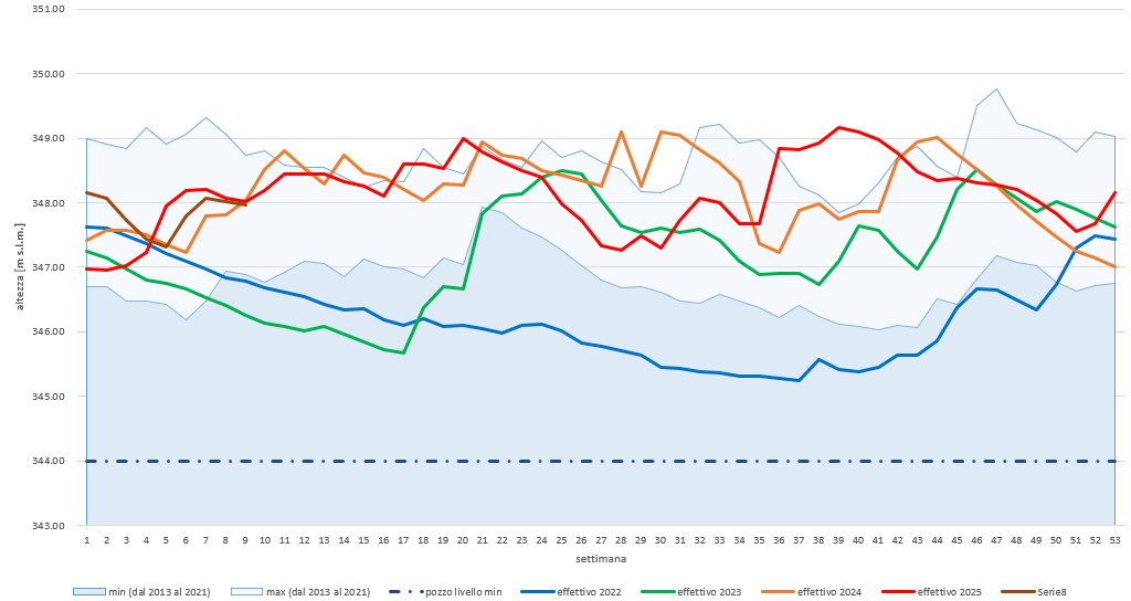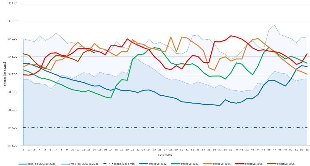 Nel grafico sono rappresentati i minimi e massimi della falda durante gli ultimi anni, in rosso quella dell'anno in corso.